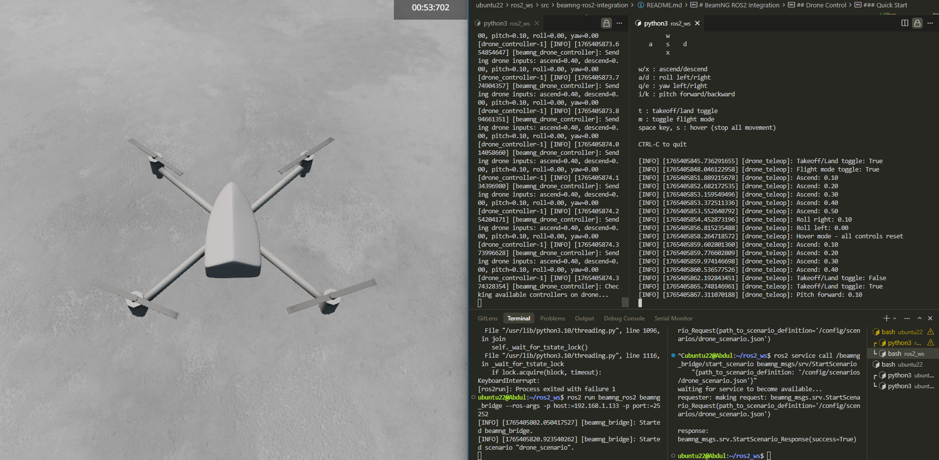 You can now control a BeamNG.tech drone using a ROS 2 based keyboard teleop setup. The system listens to the /drone_control ROS 2 topic and translates those messages into Lua commands for BeamNG’s droneInput controller, letting you fly the drone in real time takeoff, landing, movement, and orientation included.