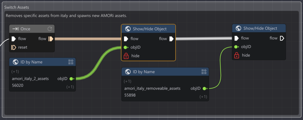 1.- the Show/Hide Object node is used to show the prefab with the newly placed assets and to hide the prefab with the assets to be removed