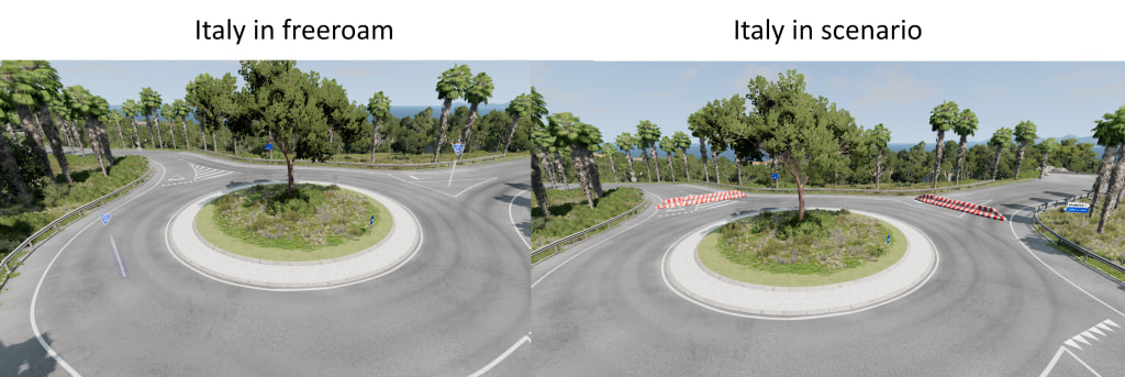 Two new scenarios are to be created with the official BeamNG map Italy, in which selected assets (such as traffic signs and road barriers) will be added. However, these assets should only be displayed in the scenarios and not during freeroam on the same map.
